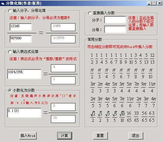 《数学工具》为您提供了一份常用分数表,您只要双击鼠标就可以向文档中插入分数而不需要输入任何数字。在不选中任何文字时,单击“数学工具主工具栏”中的”分数“按钮 (如下图所示),此时会弹出一个“分数化简”的界面: